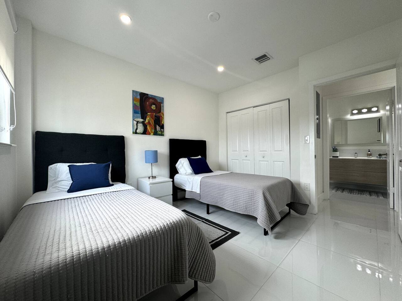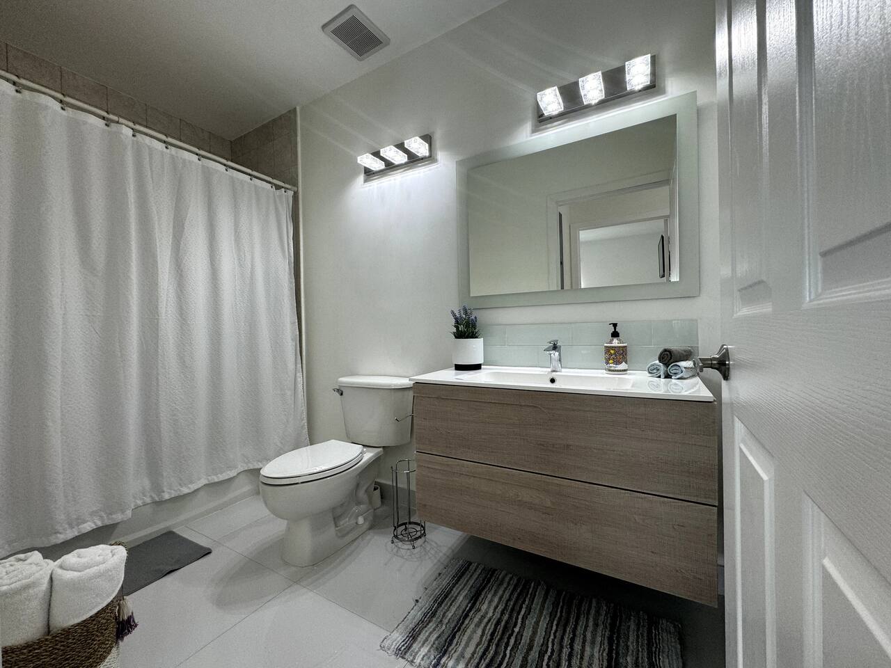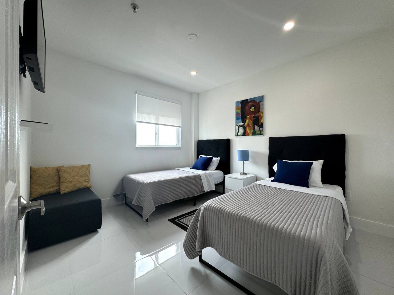 Step into a bright, modern apartment designed for comfort and convenience. The open-concept living area, filled with natural light, invites you to relax on the leather sofa or enjoy a meal at the dining table. Step out onto the small balcony to enjoy a coffee with city views. Key Features: Accommodates up to 4 guests Bedroom 1: Plush Queen Bed with Smart TV Bedroom 2: Two Twin Beds with Smart TV Living Room: Comfortable leather sofa and Smart TV Workspace: Dedicated desk with high-speed internet Kitchen: Fully equipped with stainless steel appliances (coffee machine, blender, toaster) Convenience: In-unit washer and dryer, Central AC Starter Supplies Provided: Bath: Towels, shampoo, conditioner, body soap Kitchen: Coffee, tea, water, sugar, paper towels General: Toilet paper, iron, ironing board, hairdryer, hangers, luggage rack