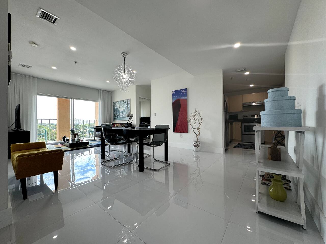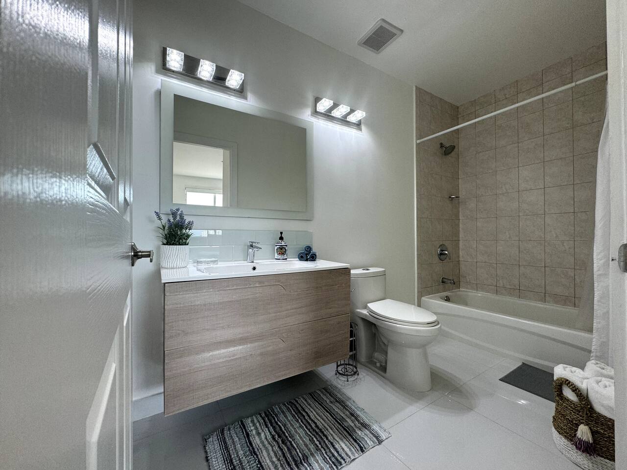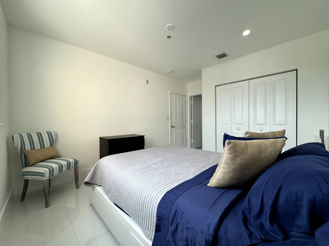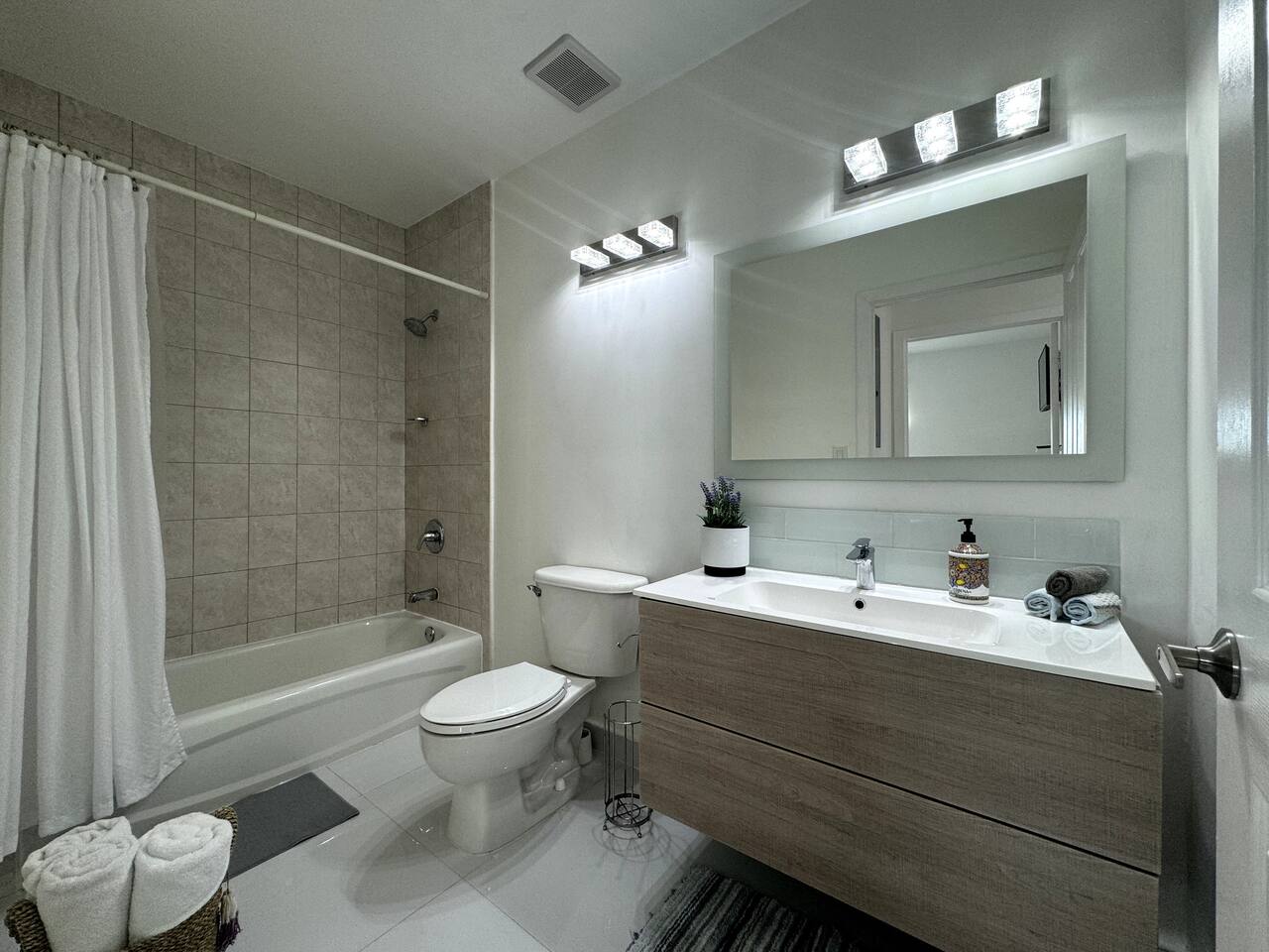 Step into a bright, modern apartment designed for comfort and convenience. The open-concept living area, filled with natural light, invites you to relax on the leather sofa or enjoy a meal at the dining table. Step out onto the small balcony to enjoy a coffee with city views. Key Features: Accommodates up to 4 guests Bedroom 1: Plush Queen Bed with Smart TV Bedroom 2: Two Twin Beds with Smart TV Living Room: Comfortable leather sofa and Smart TV Workspace: Dedicated desk with high-speed internet Kitchen: Fully equipped with stainless steel appliances (coffee machine, blender, toaster) Convenience: In-unit washer and dryer, Central AC Starter Supplies Provided: Bath: Towels, shampoo, conditioner, body soap Kitchen: Coffee, tea, water, sugar, paper towels General: Toilet paper, iron, ironing board, hairdryer, hangers, luggage rack