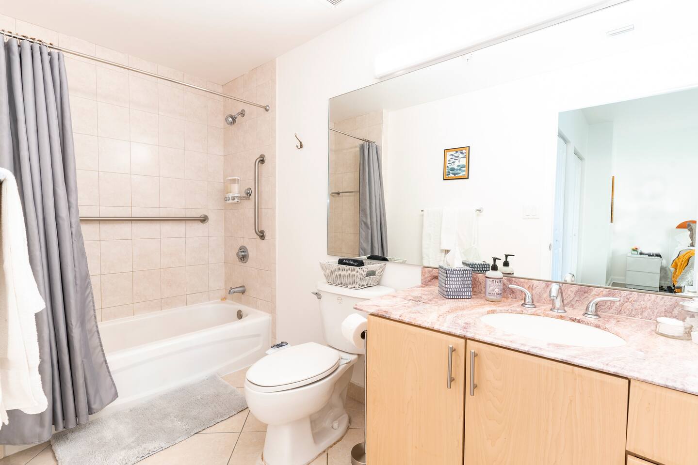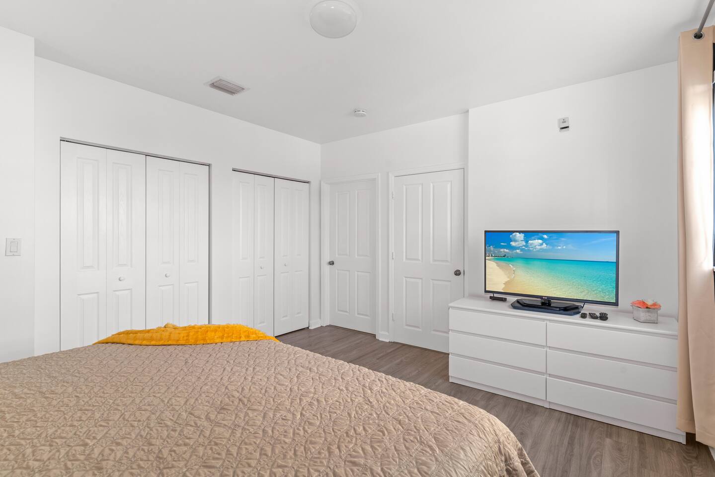 Step into a stylish, open-concept living area designed for comfort and convenience. Relax on one of two plush sofas and stream your favorite shows on the Smart TV. A dedicated desk with high-speed Wi-Fi provides a perfect workspace. Prepare delicious meals in the fully equipped kitchen, complete with a coffee machine, blender, toaster, and all the pots and pans you'll need. Enjoy your creations at the dining table. The apartment features two serene bedrooms for a restful night's sleep. The master bedroom includes a king-size bed and a Smart TV, while the second bedroom offers a queen-size bed and its own Smart TV. For your convenience, we provide: In-unit washer and dryer Fresh towels, shampoo, conditioner, and body soap Essentials like toilet paper and paper towels Complimentary coffee, tea, and water An iron, ironing board, hair dryer, and safe box